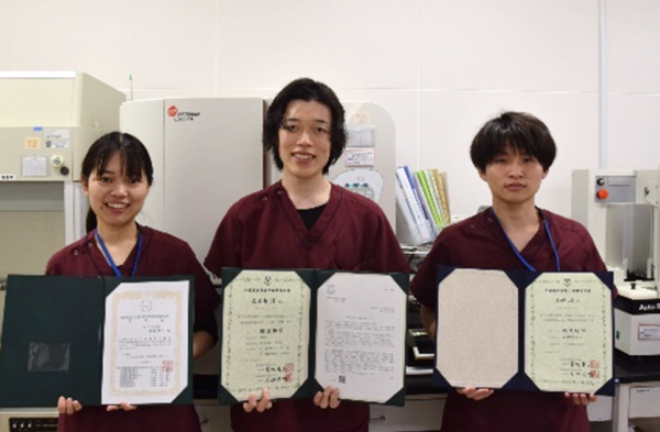 検査部検査第三課微生物検査室の3名が、それぞれ日本臨床検査同学院認定のー級臨床検査技師、二級臨床検査技師、臨床微生物学会認定の認定臨床微生物検査技師の資格を取得いたしました。日々の業務の中で培ってきた知識や経験を活かしながら、改めて基礎から学び直す機会を得たことで、微生物検査に対する理解をより一層深めることができました。今回の資格取得は、私たち自身のスキルアップのみならす、チーム全体としての検査精度や対応力の向上にもつながるものと考えています。