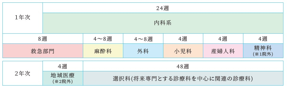 1年目は内科24週、救急部門8週、麻酔科4~8週、外科4~8週、小児科4週、産婦人科4週、精神科4週、(一般外来含む)を必修とし、2年目は地域医療4週、残りは選択とする。