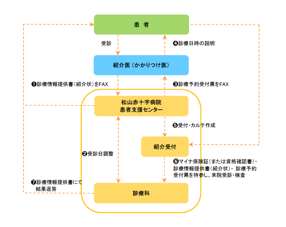 当院は、事前に「診療情報提供書」(紹介状)をFAXいただきますと、受診日時の予約が可能です。また、当日患者さんは南棟(新棟)総合受付内の「1.紹介受付」にお越しいただくことで初診受付の手続きが不要となり、待ち時間の短縮になります。事前FAXにてご予約をお取りいただきますようお願いします。診療情報提供書(紹介状)の書式は当院ホームページからダウンロードするか、患者支援センター(直通  089-926-9527)へご連絡ください。