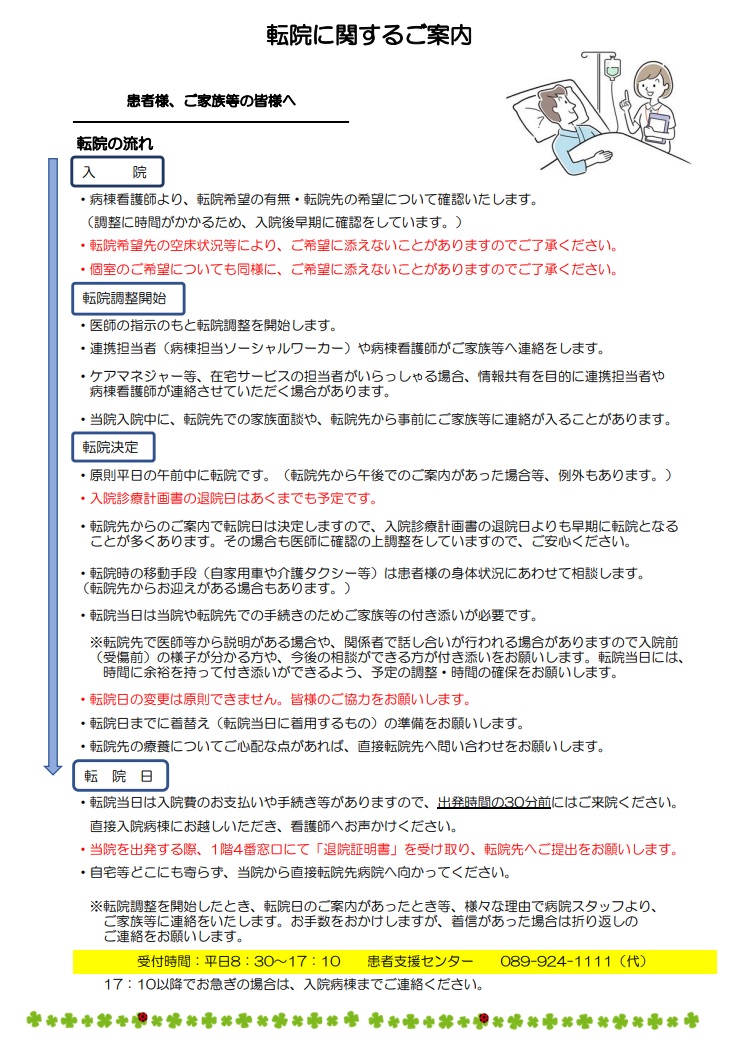急性期の病状が過ぎ、病状がある程度安定した患者さんへ、「在宅での療養」あるいは、お近くの「かかりつけ医」の先生方に引き続きの治療をお願いするか、又は病状に適した他施設をご紹介することがありますので、何卒ご理解とご協力をお願いいたします。