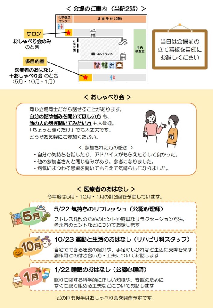 同じ悩みや不安について語り合い交流できるがん患者さんとご家族のためのサロンを開催しています。